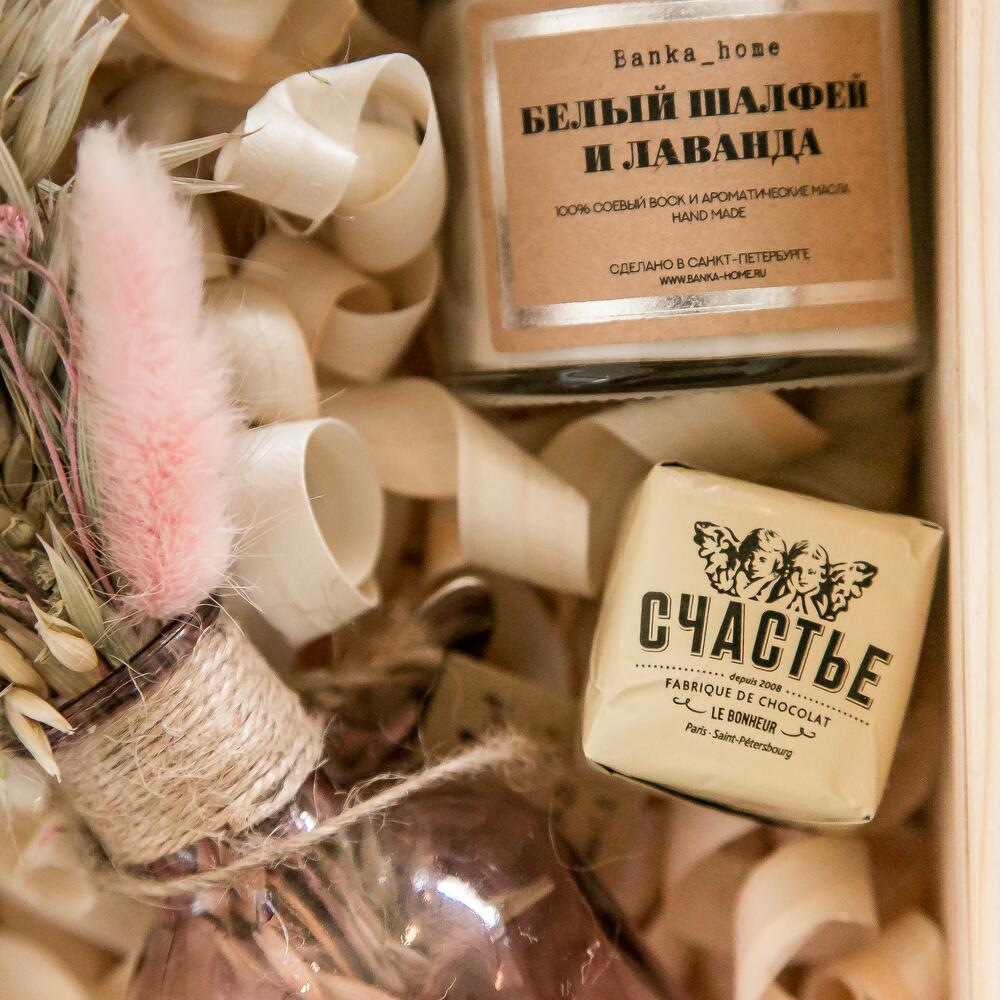 Ваза стекло – 1 шт.Ящик деревянный – 1 шт.конфеты счастье – 2 шт.букет сухоцветов – 1 шт.свеча банка home – 1 шт.бомбочка из натуральных масел для ванной – 1 шт.