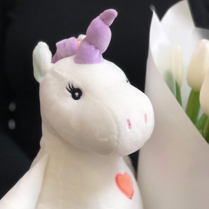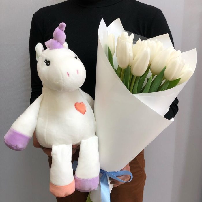 Лента атласная – 1 шт.Упаковка дизайнерская – 1 шт.Тюльпан белый – 15 шт.мягкая игрушка единорог – 1 шт.