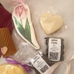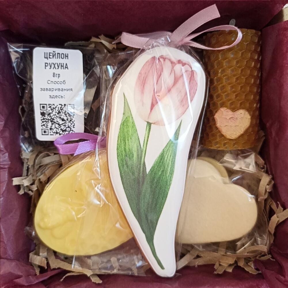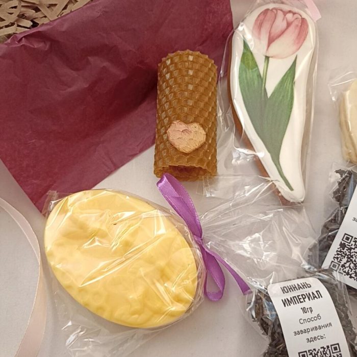 Подарочная упаковка – 1 шт.Чай черный – 2 шт.печенье ручной работы – 1 шт.свеча из вощины – 1 шт.пряник ручной работы тюльпан (без меда) – 1 шт.медовое мыло – 1 шт.